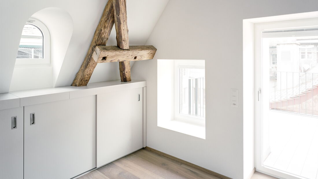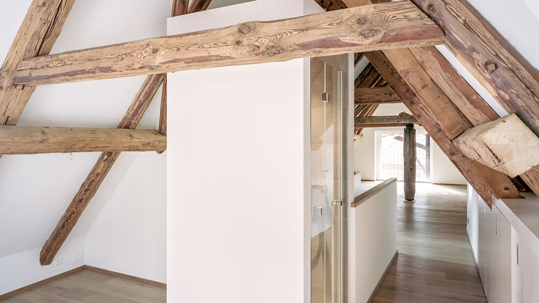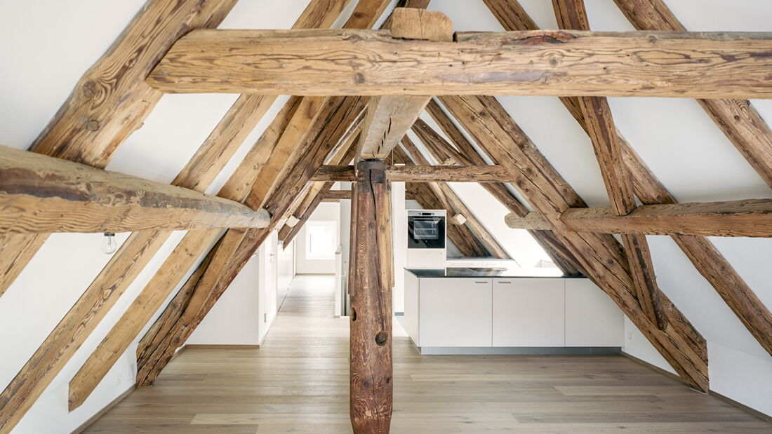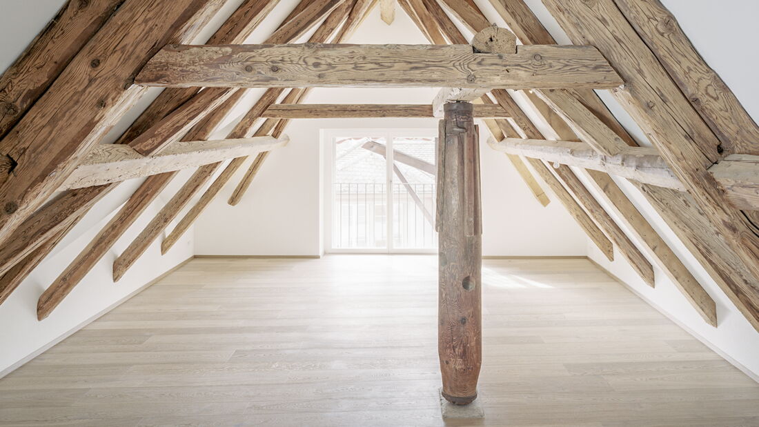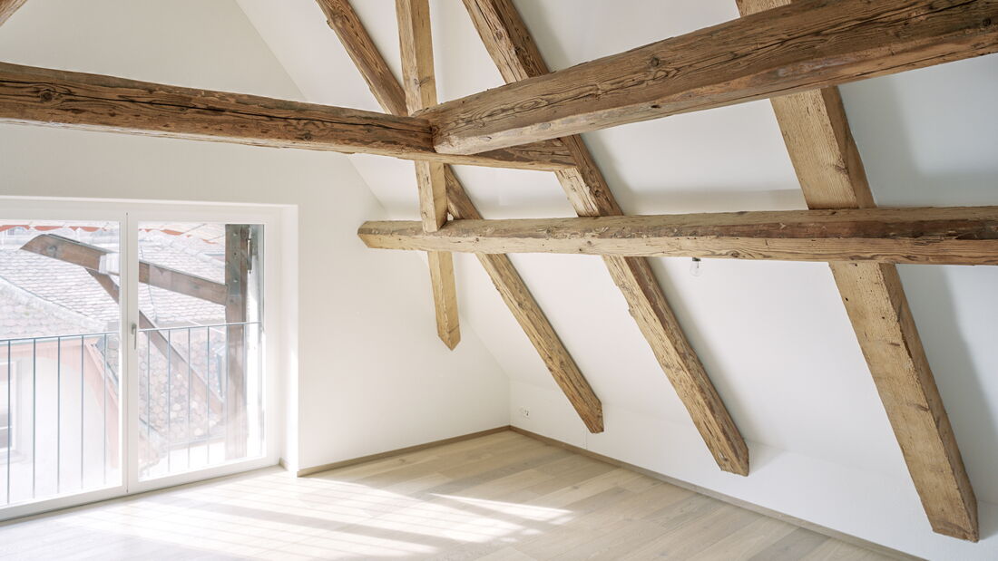 Einbau Dachwohnung und Dachsanierung an der Milchgasse in Aarau. Geplant und umgesetzt von Brunner Planungen GmbH in Zusammenarbeit mit der Brunner Zimmerei Holzbau GmbH.