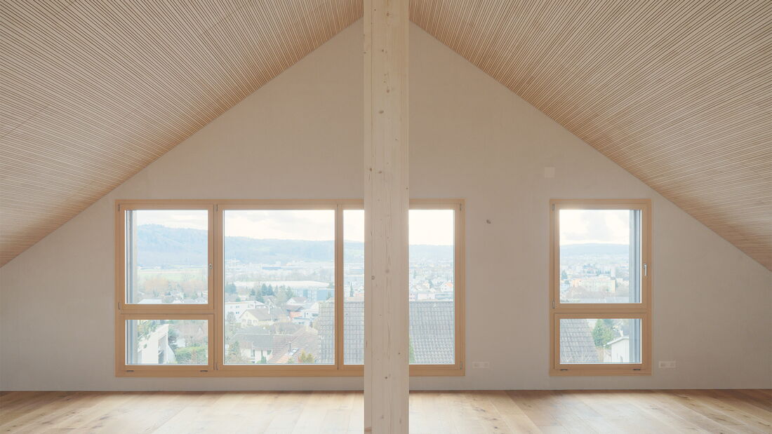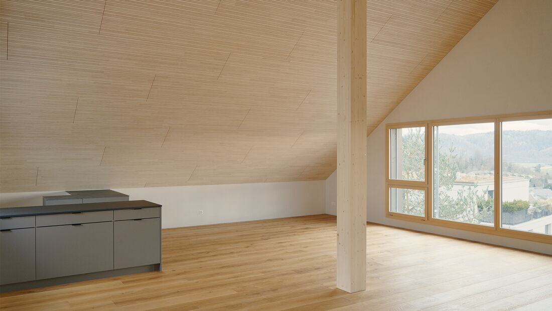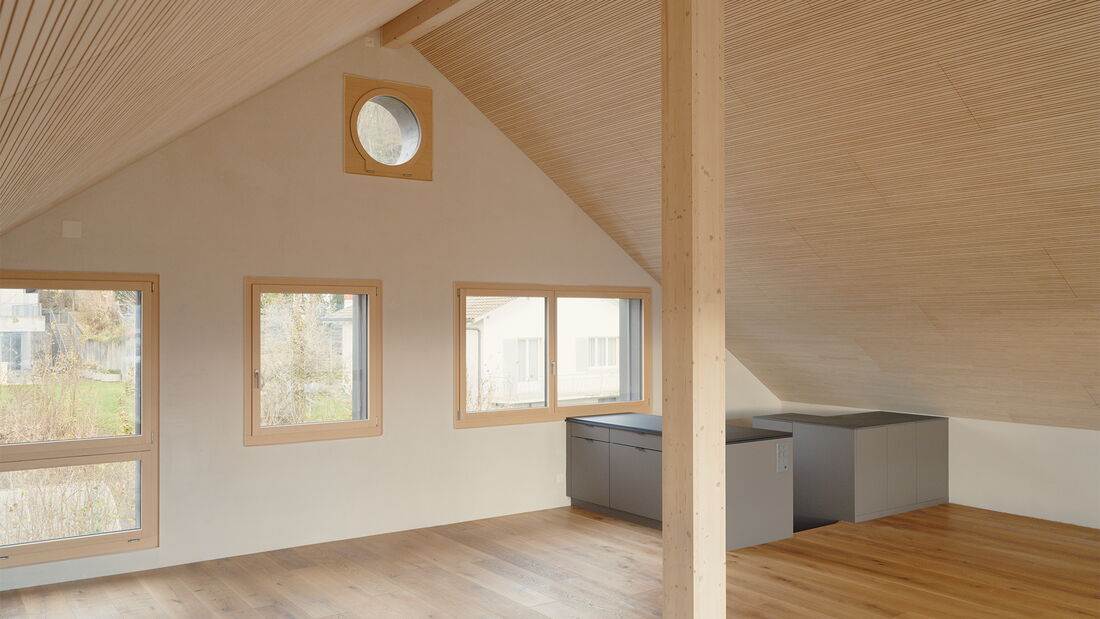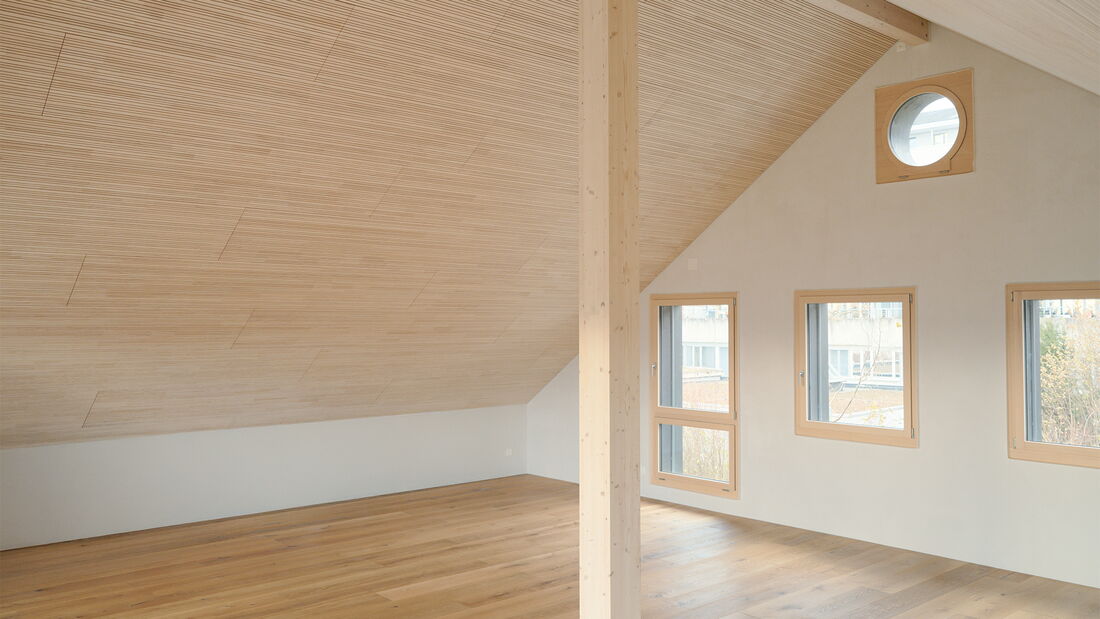 Moderne Aufstockung zur Wohnraumerweiterung. Innenausbau mit Akustikdecke. Geplant von der Brunner Planungen GmbH, ausgeführt von der Brunner Zimmerei Holzbau GmbH.