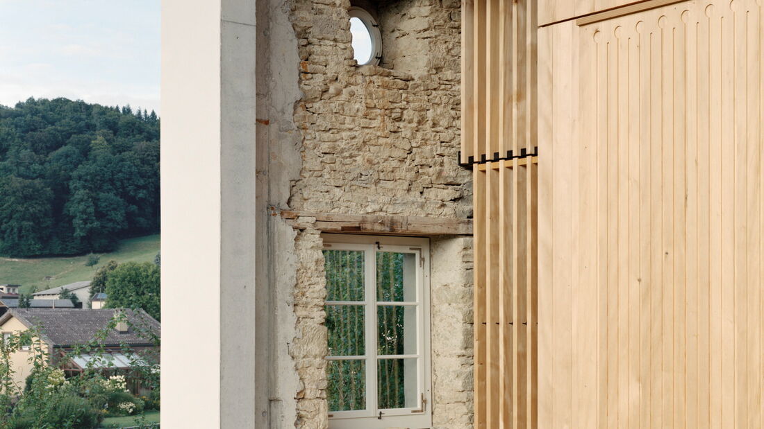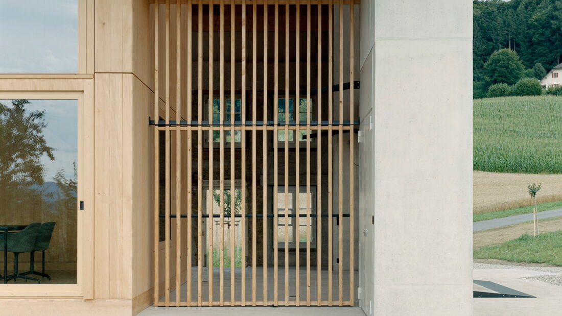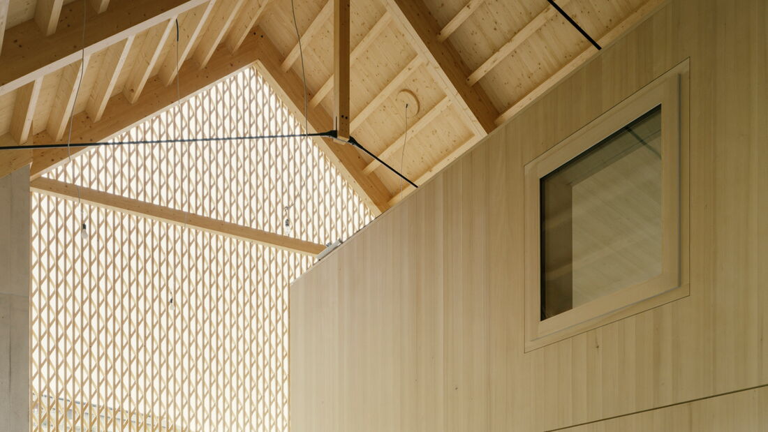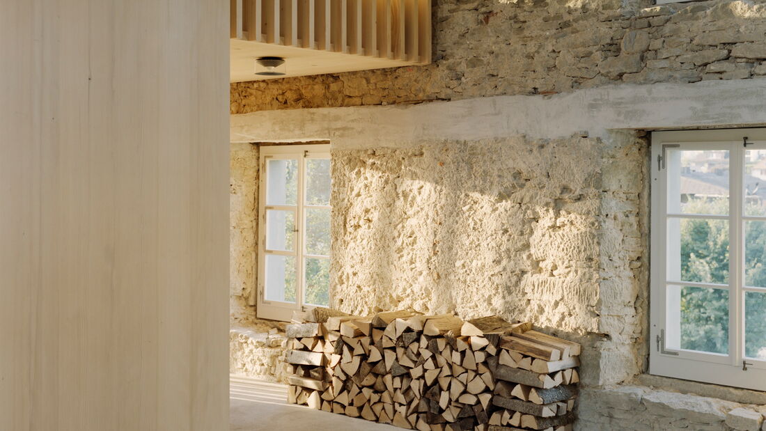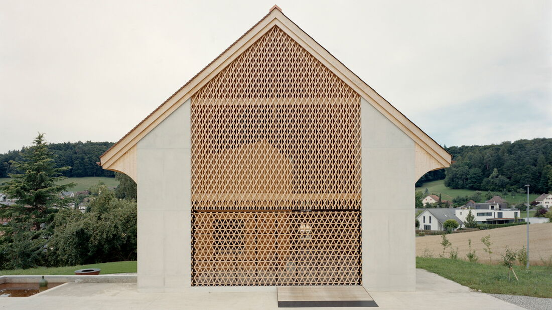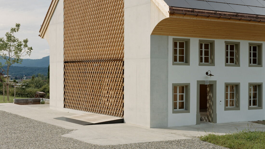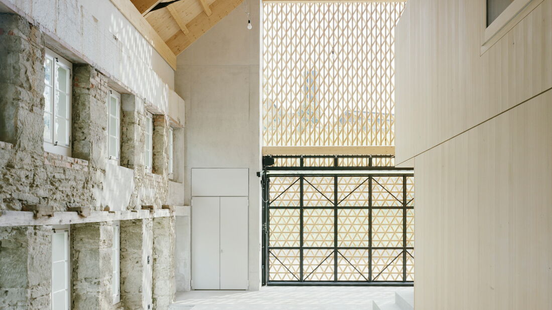 Bei diesem aussergewöhnlichen Sanierungsprojekt eines Bauernhauses aus dem Jahr 1851 blieb die gemauerte Hülle des Wohngebäudes weitgehend erhalten. Der freigestellte Innenraum wurde zu einer Halle für ein kleines Haus umgewandelt – ein «Haus im Haus». Geplant von der Architekten Gemeinschaft 4 AG. Die Dachkonstruktion inklusive Ziegeleindeckung, die Rauten-Fassadenornamente an der Südfassade sowie bewegliche Elemente wie die Pivot-Türen aus Holzlamellen wurden von der Brunner Zimmerei Holzbau GmbH umgesetzt.