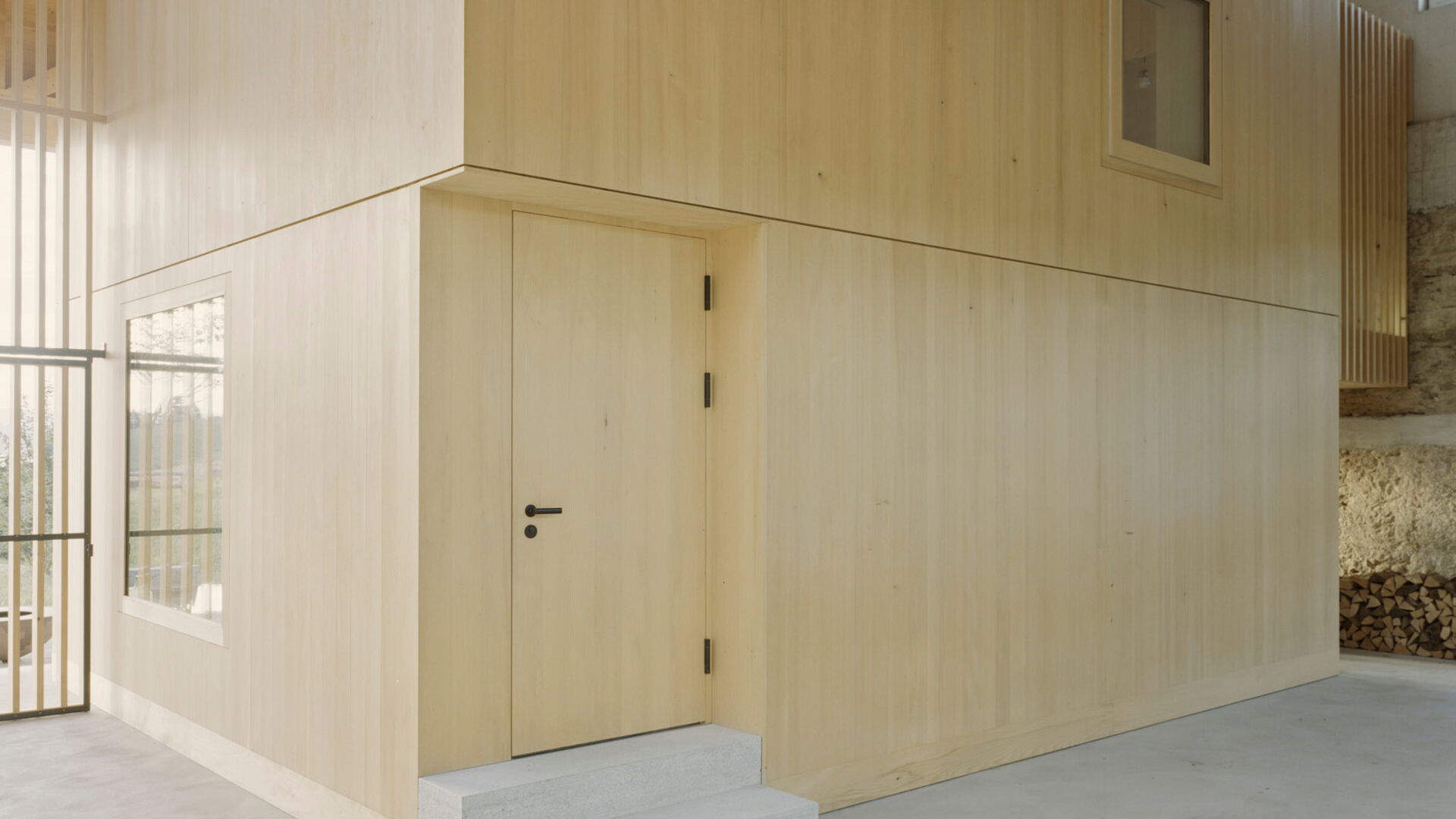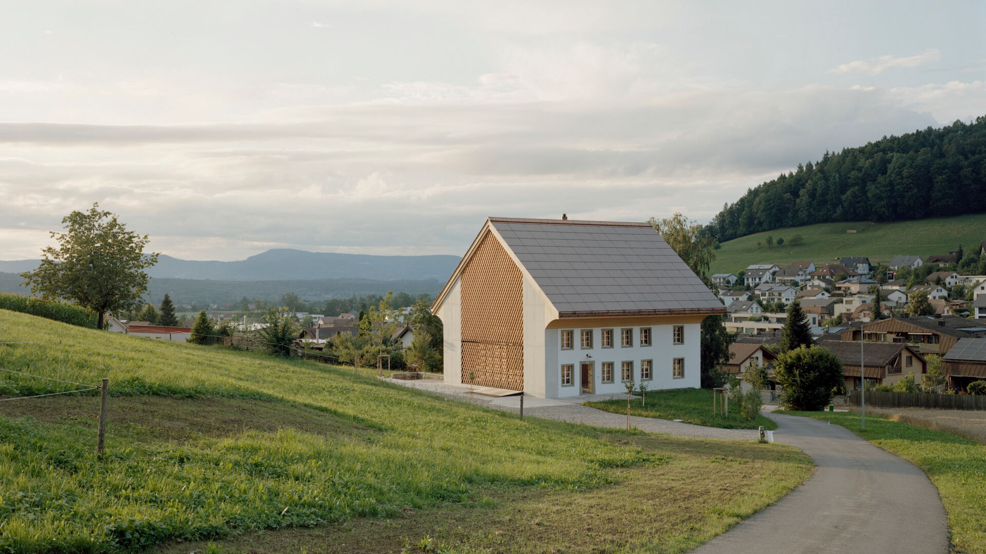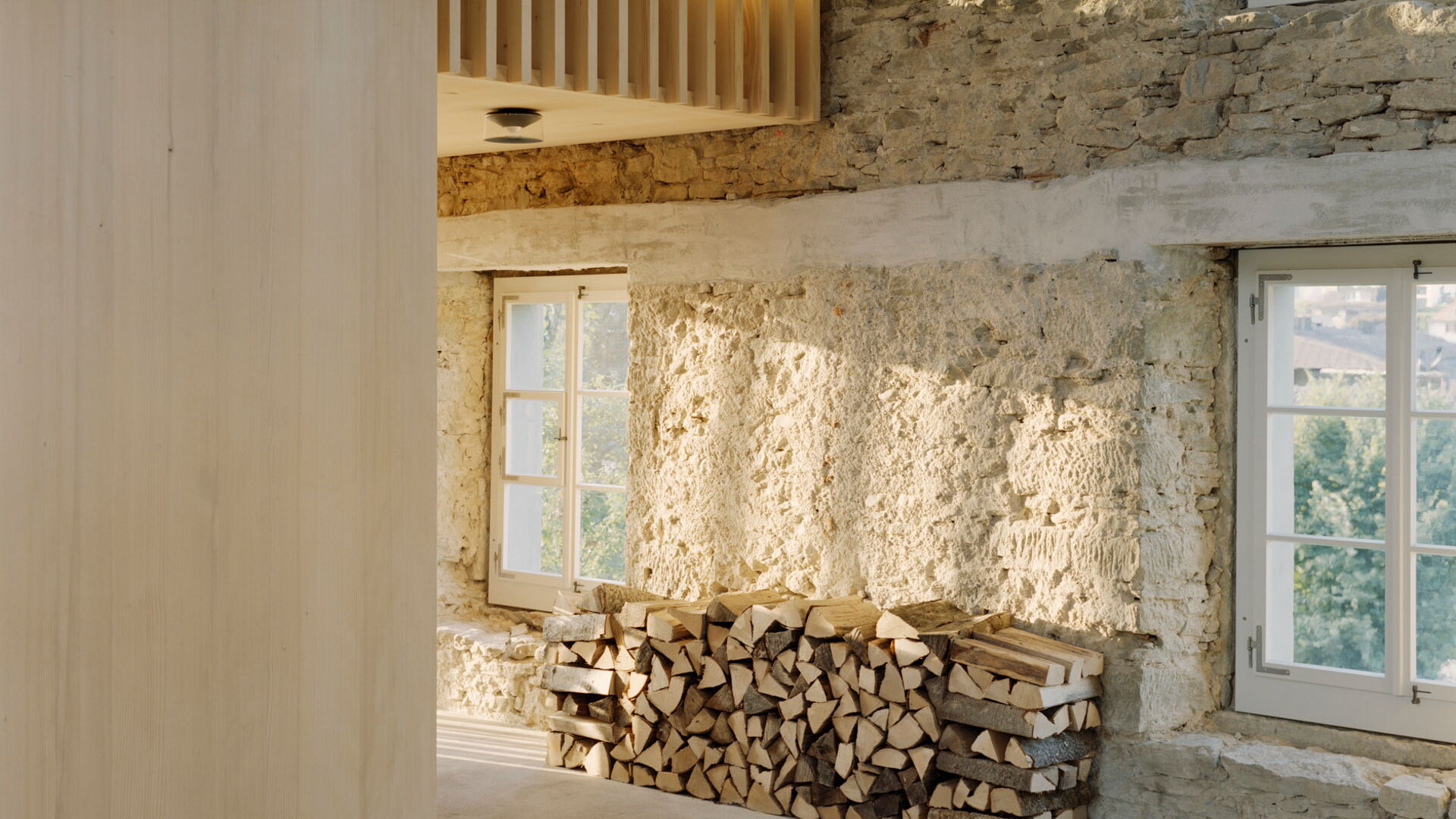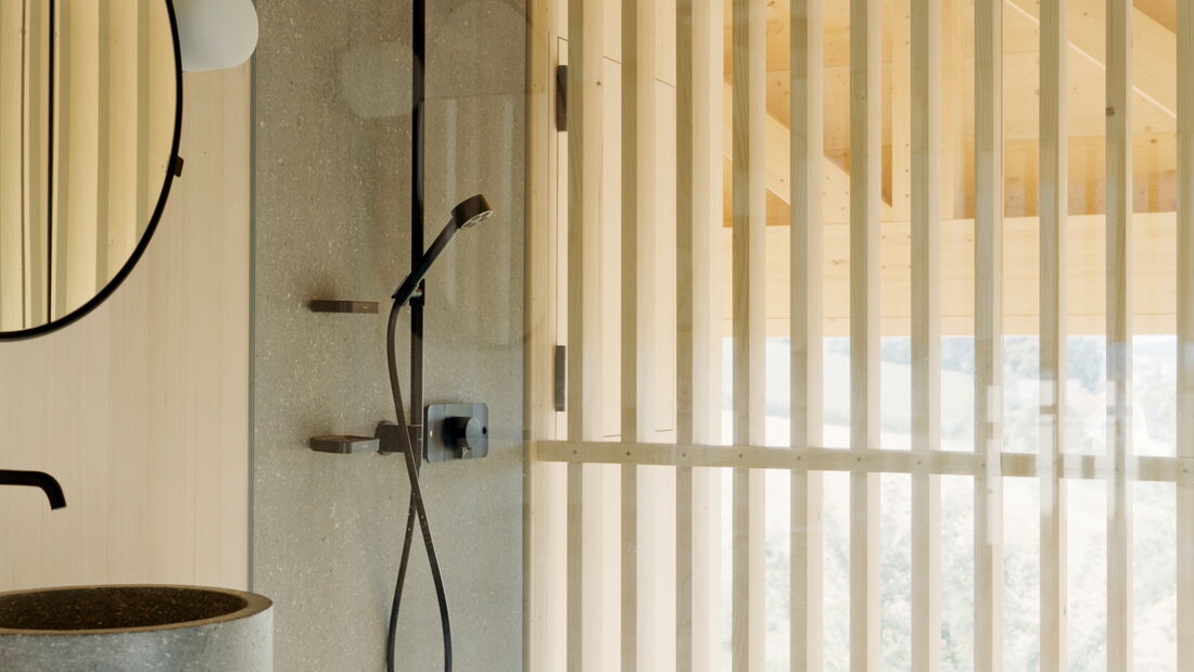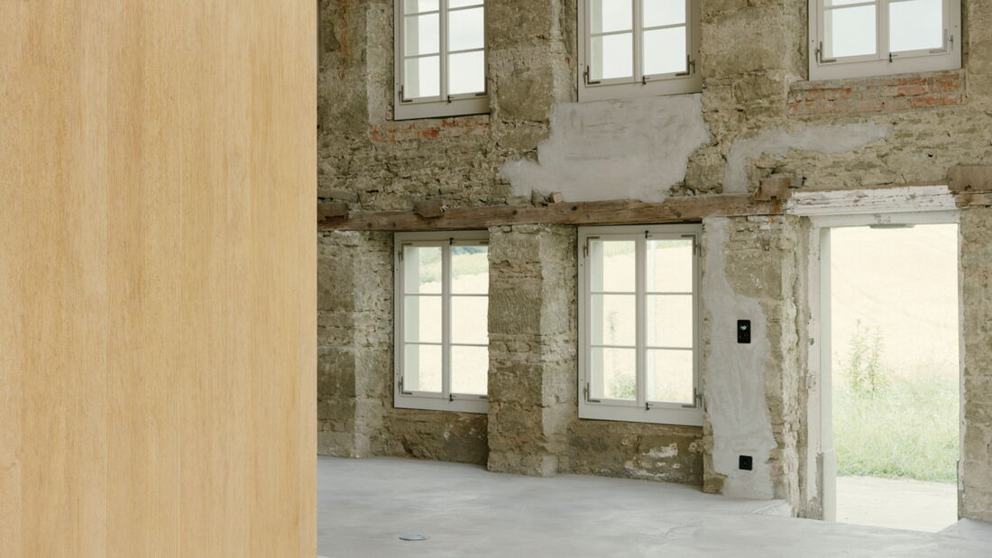Bei diesem aussergewöhnlichen Sanierungsprojekt eines Bauernhauses aus dem Jahr 1851 blieb die gemauerte Hülle des Wohngebäudes weitgehend erhalten. Der freigestellte Innenraum wurde zu einer Halle für ein kleines Haus umgewandelt – ein «Haus im Haus». Geplant von der Architekten Gemeinschaft 4 AG. Die Dachkonstruktion inklusive Ziegeleindeckung, die Rauten-Fassadenornamente an der Südfassade sowie bewegliche Elemente wie die Pivot-Türen aus Holzlamellen wurden von der Brunner Zimmerei Holzbau GmbH umgesetzt.