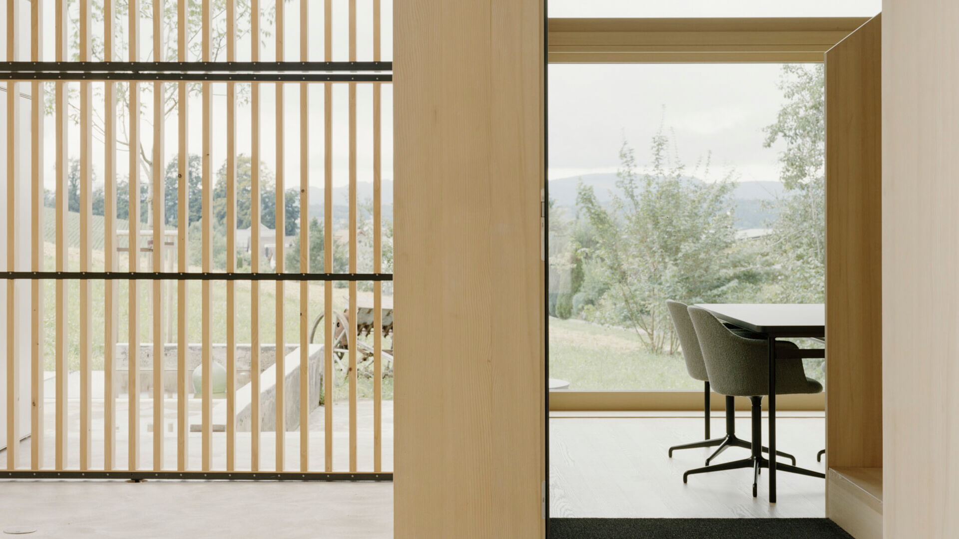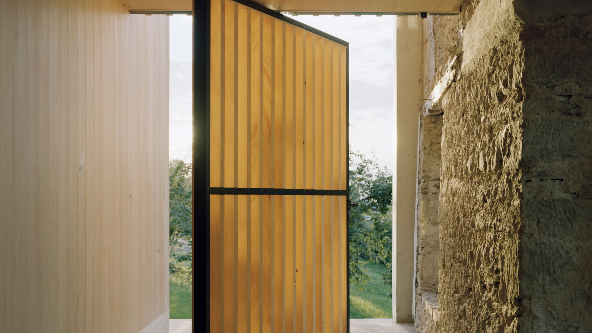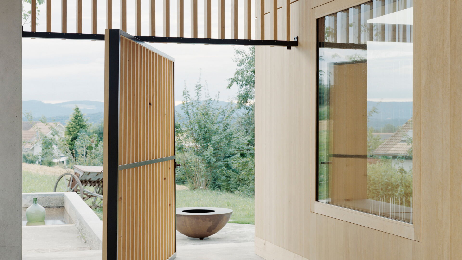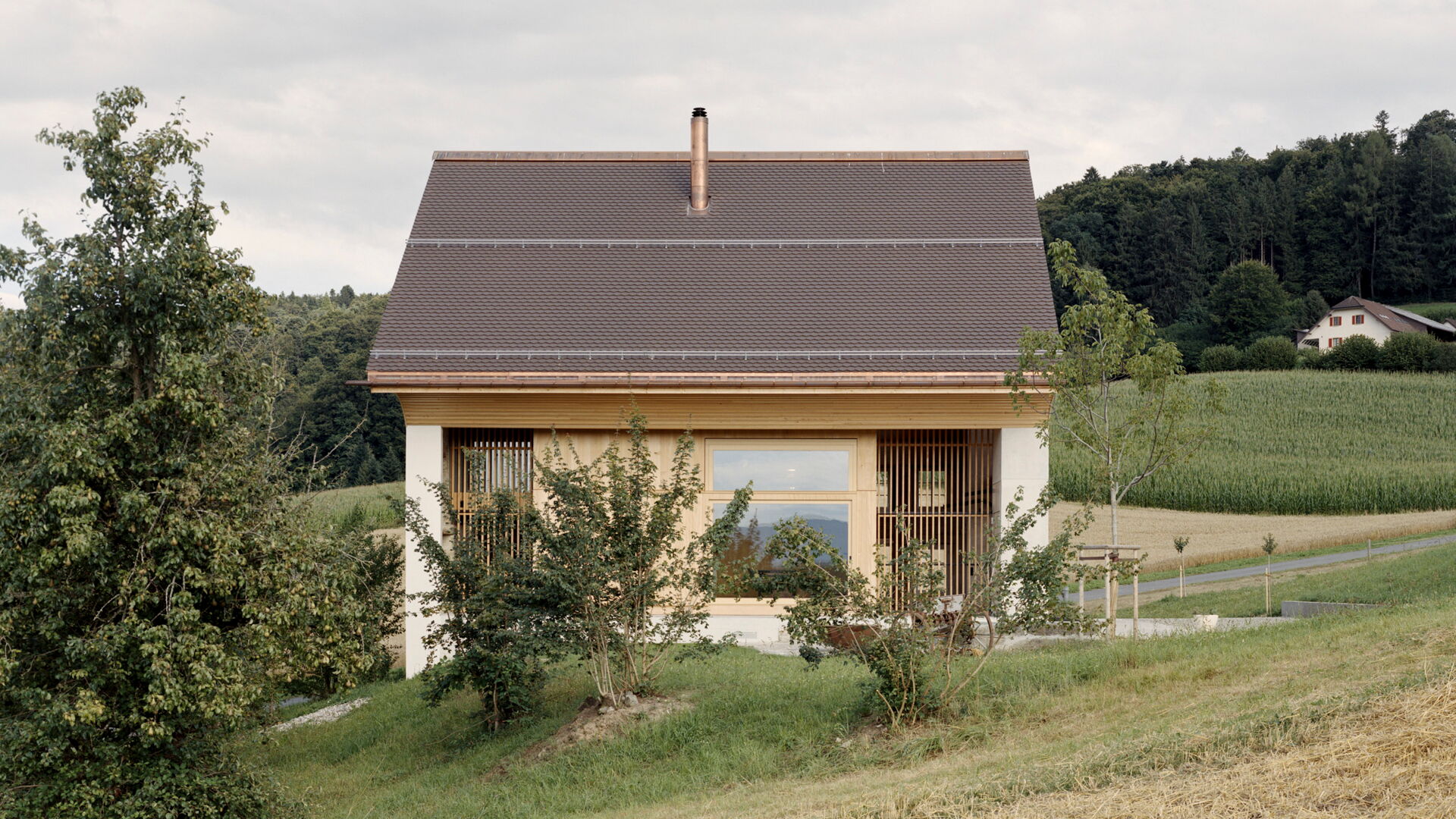 Bei diesem aussergewöhnlichen Sanierungsprojekt eines Bauernhauses aus dem Jahr 1851 blieb die gemauerte Hülle des Wohngebäudes weitgehend erhalten. Der freigestellte Innenraum wurde zu einer Halle für ein kleines Haus umgewandelt – ein «Haus im Haus». Geplant von der Architekten Gemeinschaft 4 AG. Die Dachkonstruktion inklusive Ziegeleindeckung, die Rauten-Fassadenornamente an der Südfassade sowie bewegliche Elemente wie die Pivot-Türen aus Holzlamellen wurden von der Brunner Zimmerei Holzbau GmbH umgesetzt.