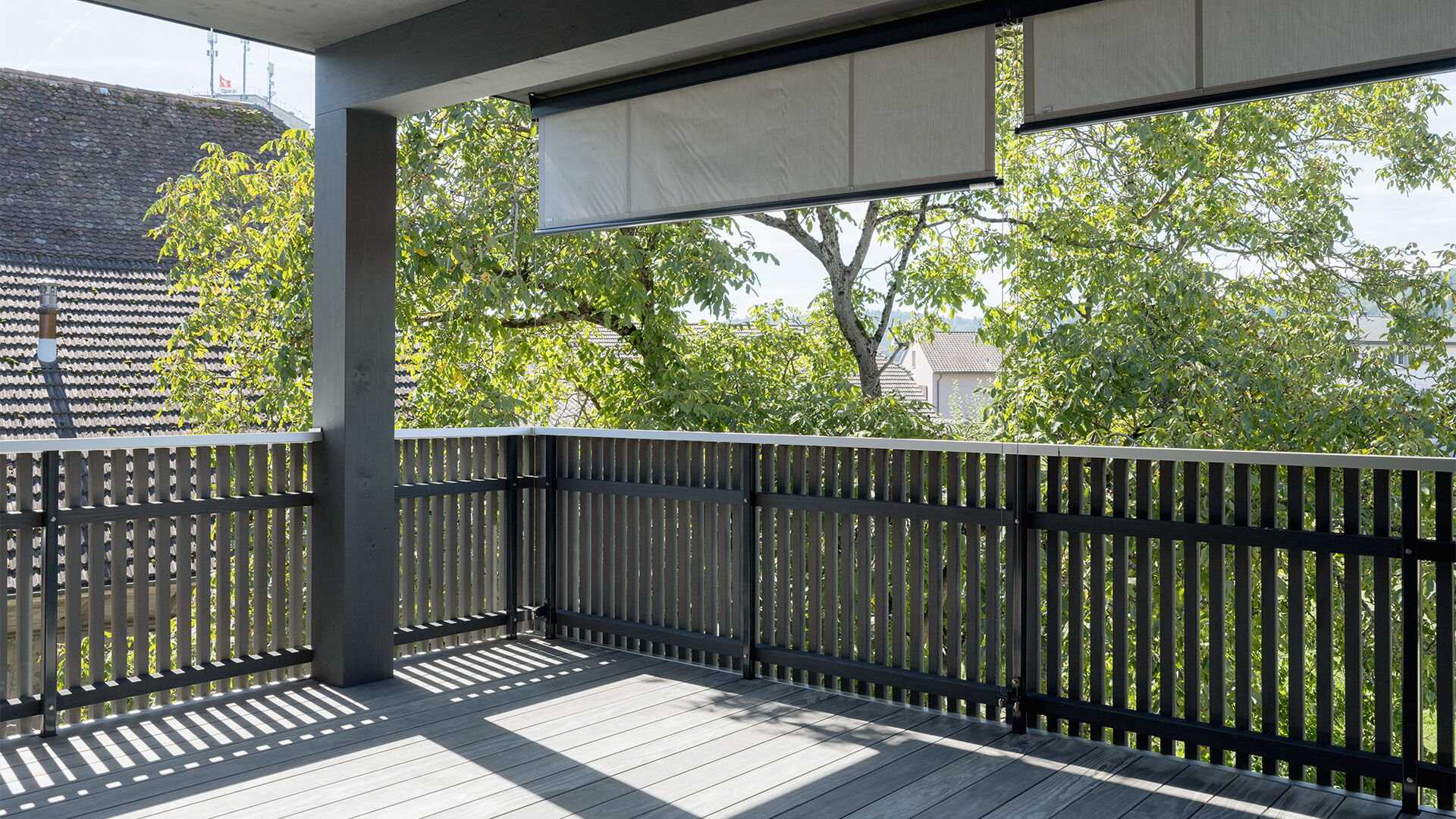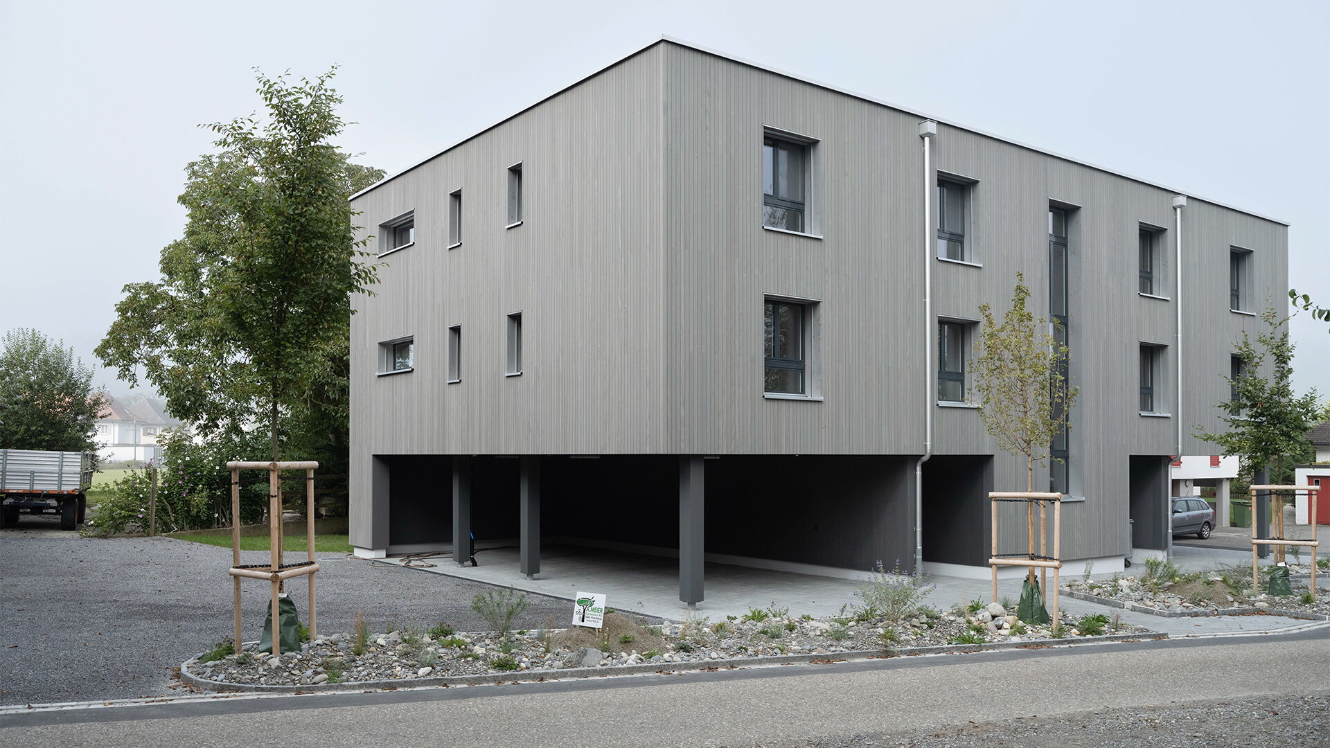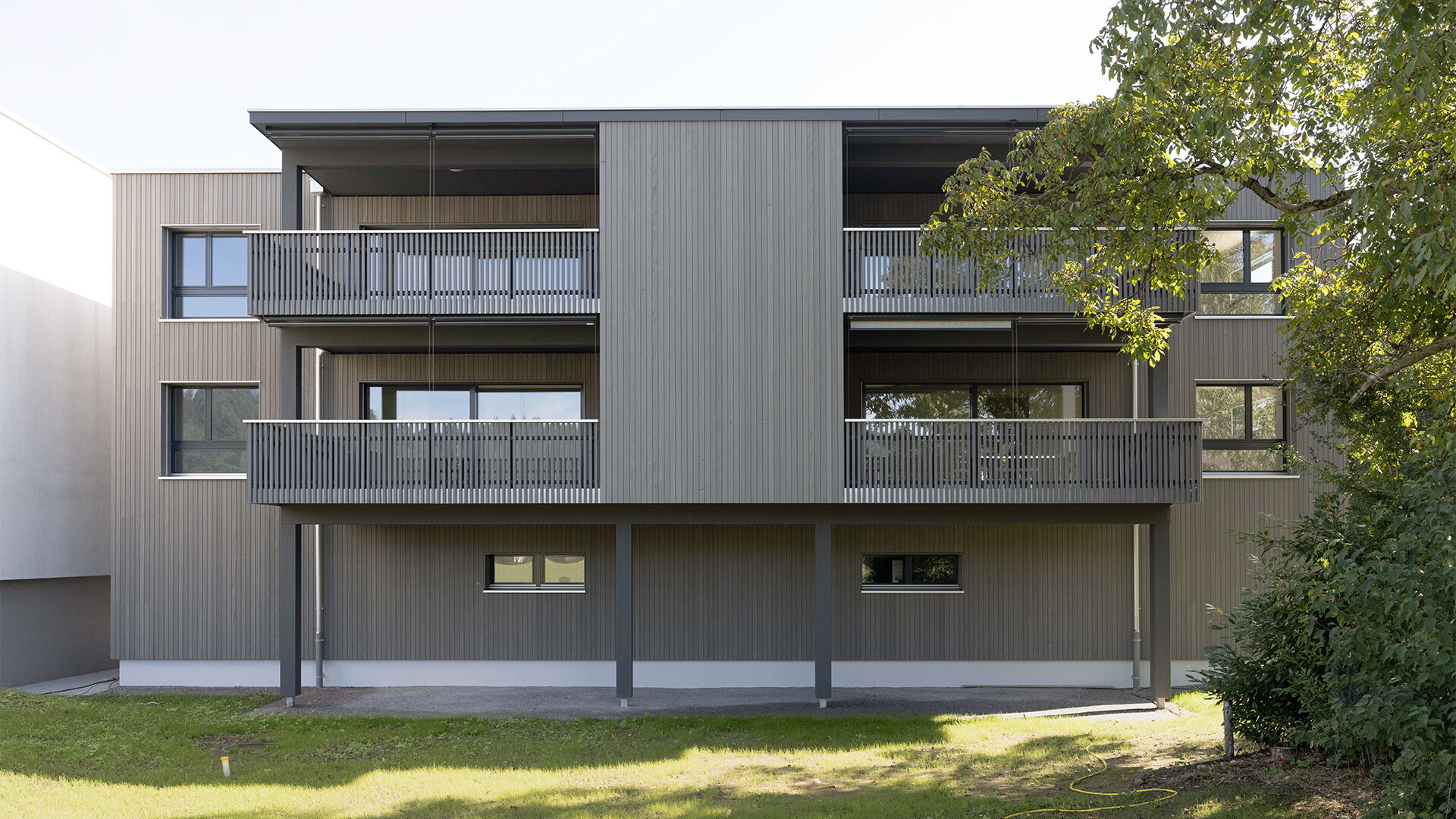 Neubau Mehrfamilienhaus in Holzbauweise mit vertikaler Fassadenschalung. Montage von Terrassendecks, Reduits und Balkongeländer. Projektierung durch die Strebel Kiener Architekten und Planer FH. Ausführungsplanung und Bauleitung durch die Brunner Planungen GmbH, ausgeführt von der Brunner Zimmerei Holzbau GmbH.